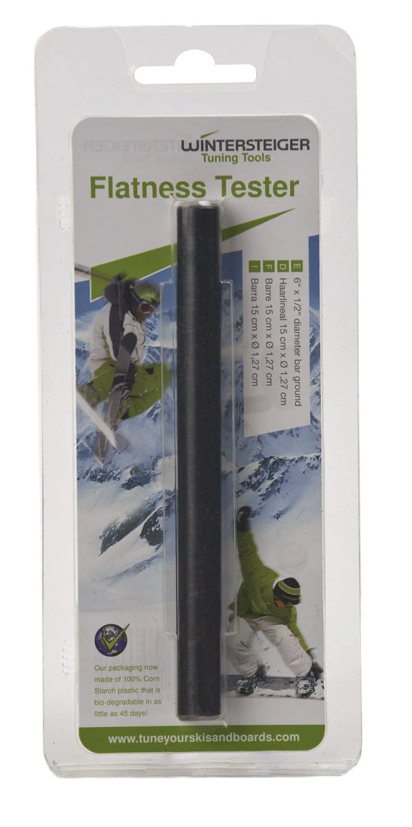 The Base Flatness Tester from Wintersteiger is a trusty way to determine if your skis are level. Even brand new skis, fresh from the manufacturer may have experienced a certain degree of warping. Skis high on the edges will feel grabby and erratic. Base high skis will feel squirrelly and ‘loosey-goosey’ underfoot. Both base high and edge high skis will require professional ski tunes. Additionally, base high skis can be difficult to fix. Make sure you bring your Wintersteiger Flatness Tester True Bar with you when ski shopping, so you know what to expect. How to check the flatness of skis: Look for light under the True Bar in the middle or by the edges of the skis when you place it on the base in the tip, under the binding, and on the tail.